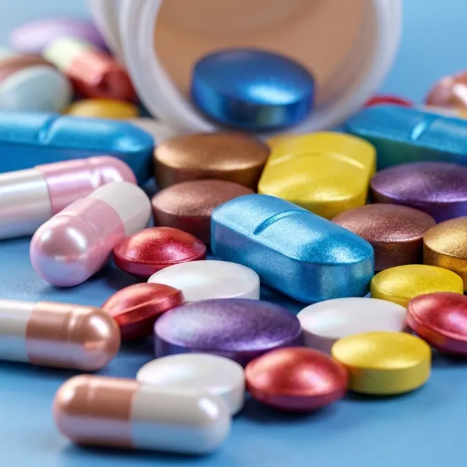 Suplementos dietarios (tabletas, cápsulas, gomitas) con acabados diferenciadores